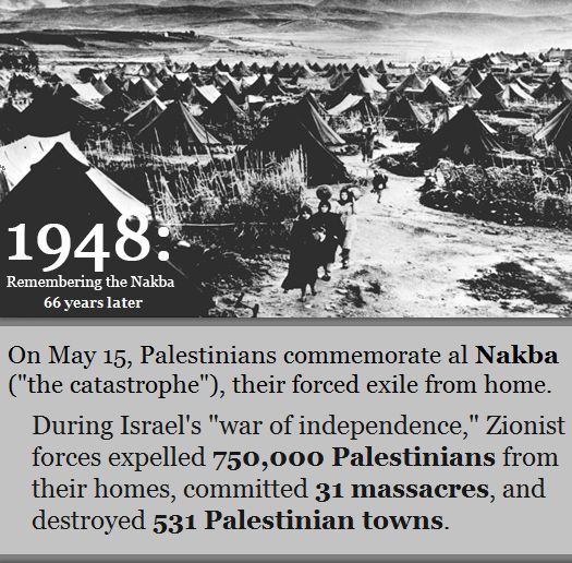 Saban tahun pada tarikh 15 Mei, rakyat Palestin dan masyarakat dunia memperingati peristiwa “Nakba”. Nakba merupakan istilah Arab yang bermaksud “malapetaka” yang merujuk kepada peristiwa pengusiran seramai 750,000 rakyat Palestin dari rumah mereka pada tahun 1948, iaitu tahun negara haram Israel ditubuhkan, dan pemusnahan beratus-ratus perkampungan mereka oleh tentera Yahudi. Manakala berjuta-juta pelarian Palestin dipaksa hidup dalam buangan di luar negara Yahudi. Dianggarkan juga bahawa 1 dalam setiap 4 rakyat Palestin adalah pelarian domestik. Semua pelarian Palestin, tanpa mengira tempat tinggal, dihalang oleh pihak Israel dari melaksanakan “hak untuk pulang”, haqq al-‘awda (“the right of return”) ke tanahair mereka, yang merupakan hak yang termaktub di dalam Artikel 13, Perisytiharan Hak Asasi Manusia Sejagat (UDHR) 1948 dan diperakui melalui Artikel 11 Resolusi 194 yang diluluskan Perhimpunan Agung Pertubuhan Bangsa-bangsa Bersatu (UNGA) pada 11 Disember 1948.